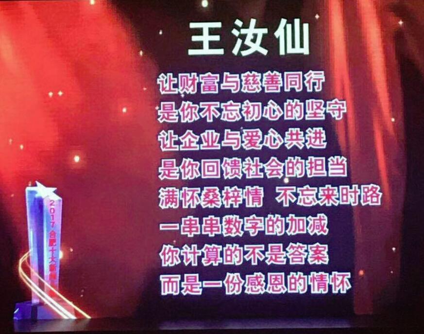 热烈祝贺王汝仙董事长荣获“2017合肥十大新闻人物”荣誉称号