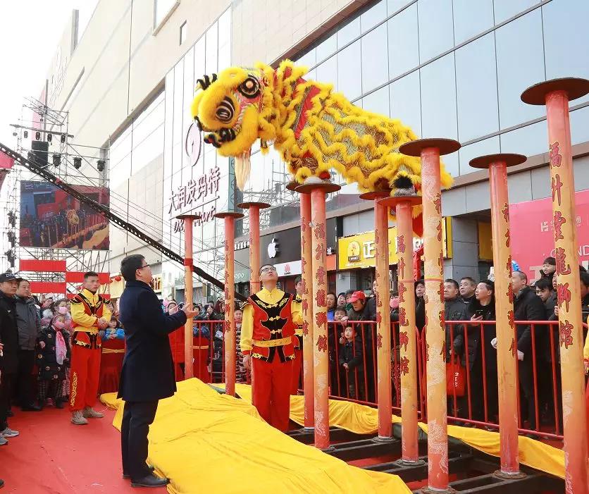 领导致辞后,醒狮点睛、舞狮梅花桩将开业盛典引入高潮。