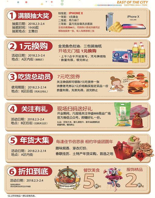 2月3日-2月4日两天,“一元换购”、“微信关注有礼”、“7元吃货总动员”、“全场餐饮五折特惠”、“赢Iphone X”、“年货大集”六重礼遇一网打尽。