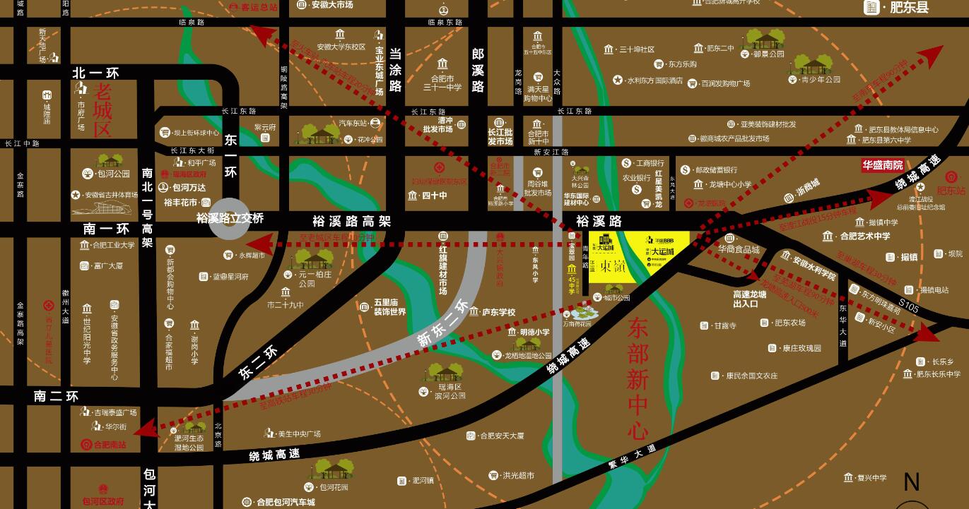 华盛大运城·东嶺:是华盛集团深耕合肥的第九个项目,位于合肥市肥东县裕溪路以南,滨河路以西,地处裕溪路高架桥东入口与龙塘高速入口,紧邻合肥知名的东二十埠河,项目有自建的二十埠河景观带和城市公园,拥有东城最佳的景观资源。周边高居住氛围浓厚,生活配套齐全,地处东部新中心的核心地带。