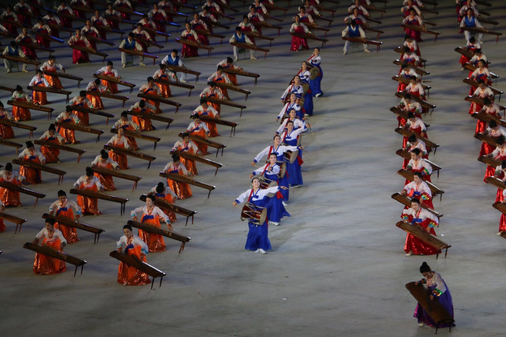 为庆祝70周年国庆,朝鲜在平壤“五一体育场”举行大型团体操表演《辉煌的祖国》。作为与中国一衣带水的友好邻邦,朝鲜的演员们用一曲《爱我中华》向场内的中国观众致敬。并在演出的背景板上,用中文标注了“团结合作,善邻友好”、“对外关系多面化”、“为了世界自主化”等内容。