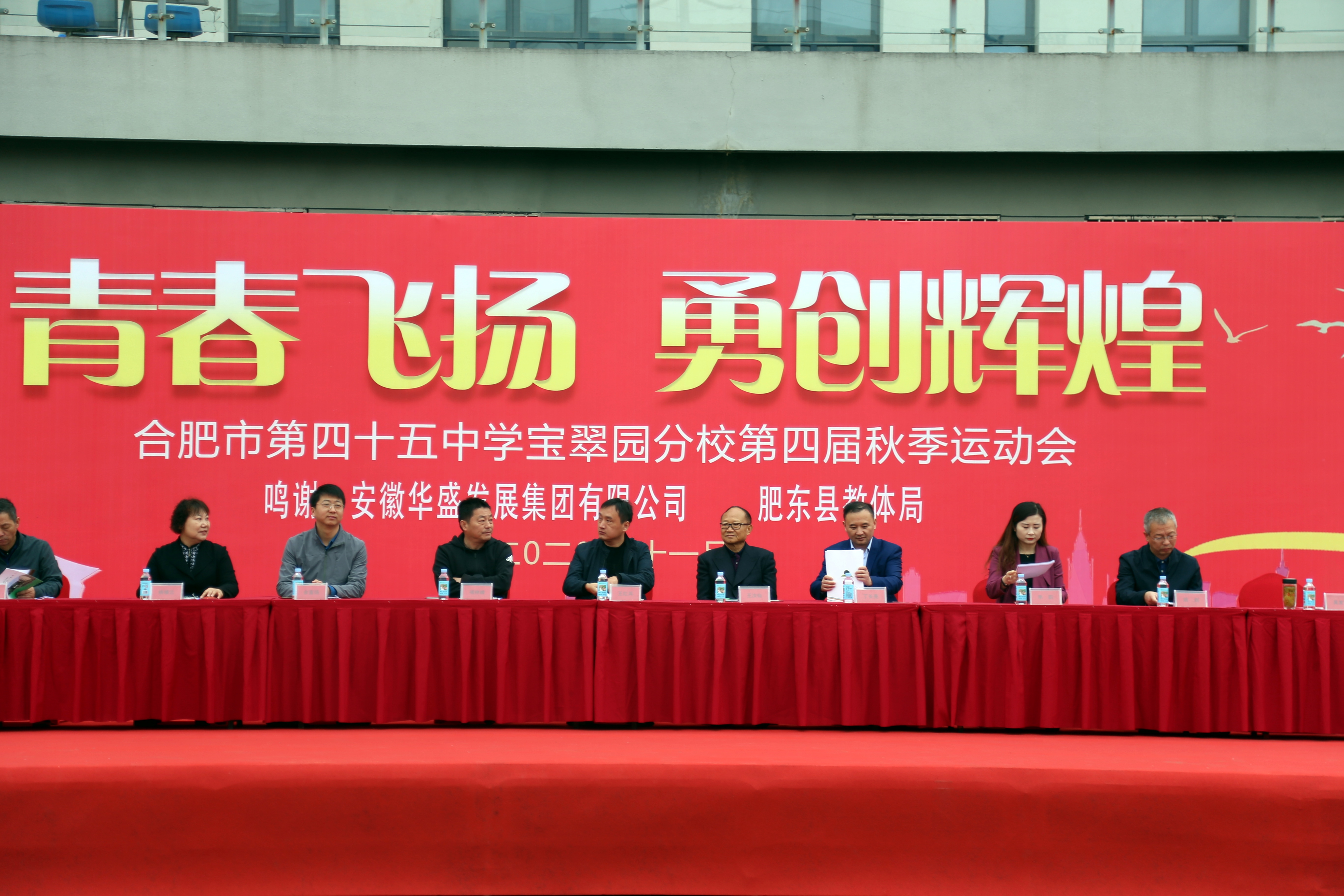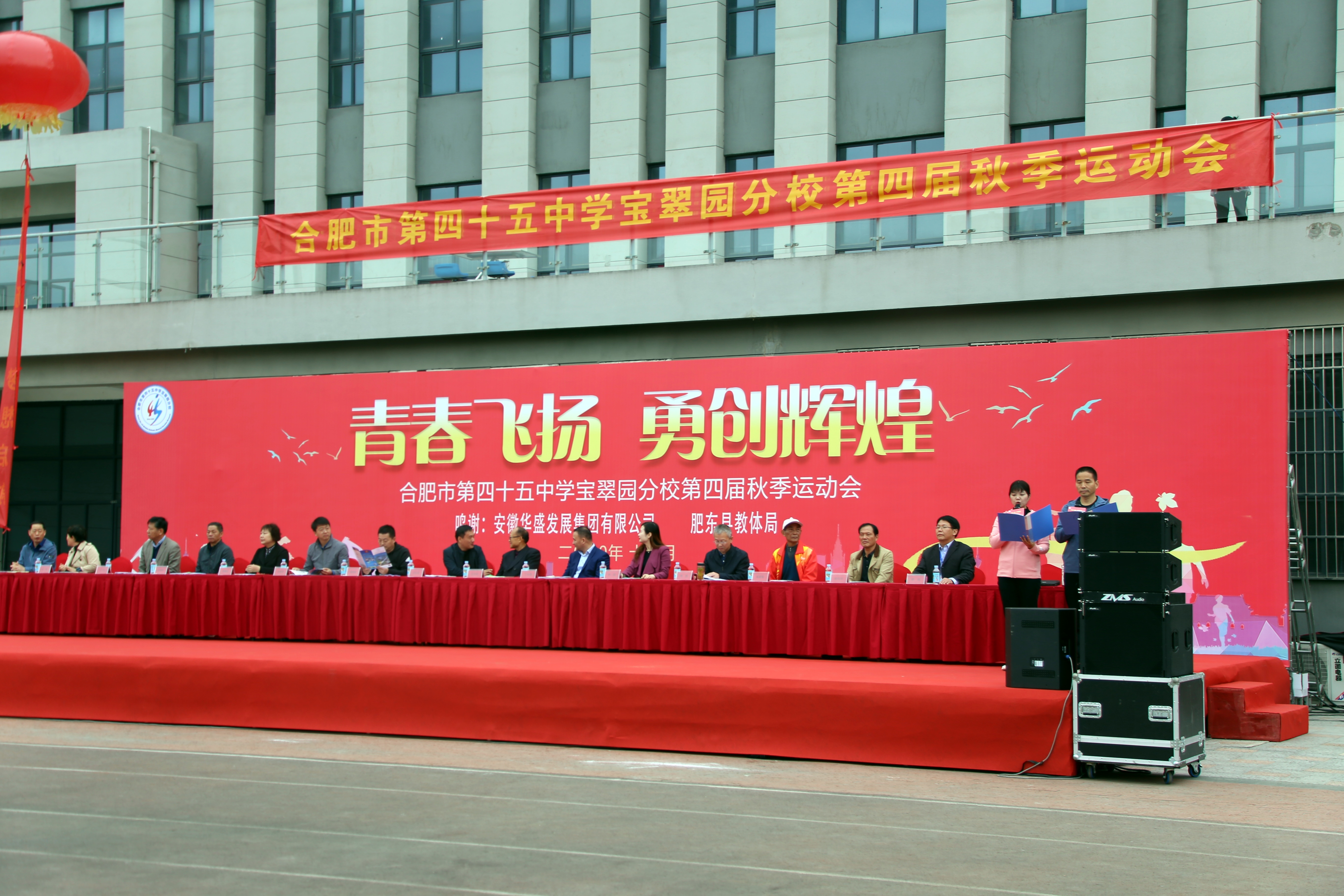 青春飞扬,勇创辉煌。2020年11月5日,合肥市第四十五中学(宝翠园分校)第四届秋季运动会正式拉开帷幕,运动会开幕式取得圆满成功。教育局相关领导、四十五中总校领导、宝翠园分校领导、安徽华盛集团董事长王汝仙先生、副董事长丁长亮先生、副总裁李莉女士参加了本次运动会开幕式。