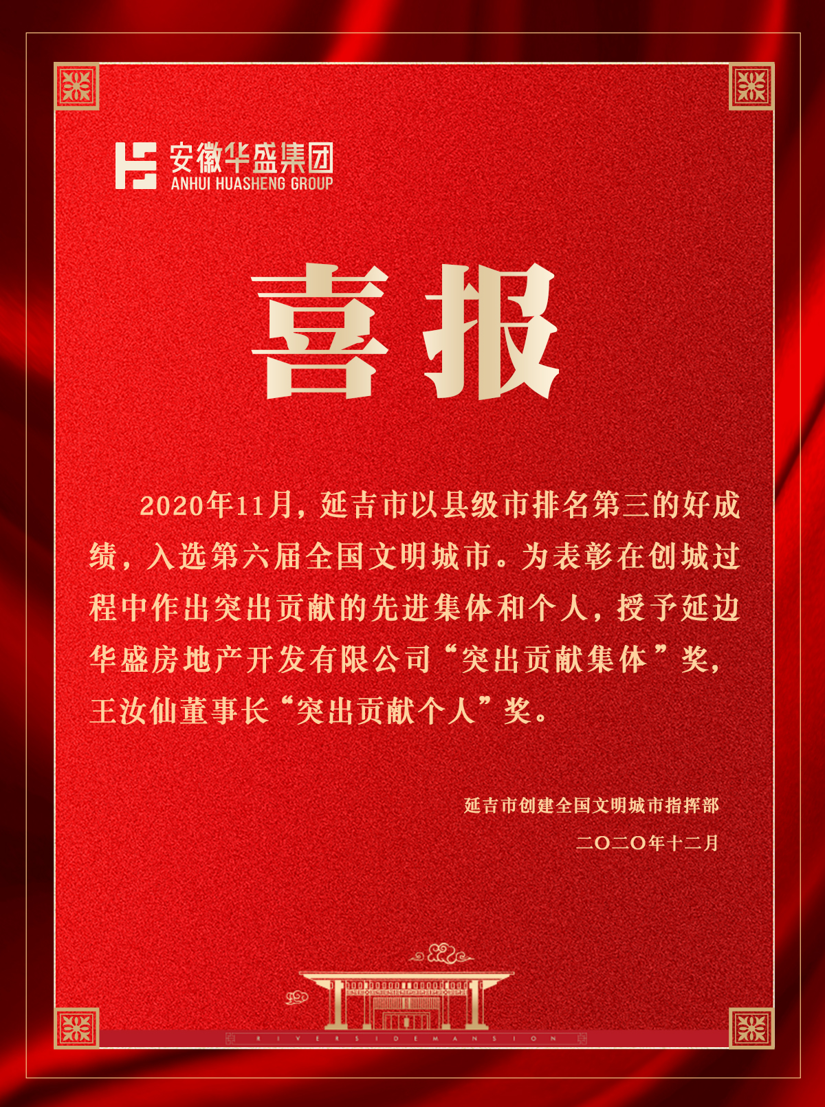 2020年12月,为表彰在创城过程中作出突出贡献的先进集体和个人,延吉市创建全国文明城市指挥部授予延边华盛房地产开发有限公司“突出贡献集体”奖,并授予王汝仙董事长“突出贡献个人”奖。