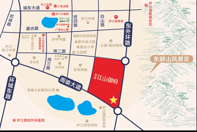 华盛·江山御府项目位于庐江县周瑜大道与外环东路交叉口西北角,地处城东新区的核心区域,交通网络四通八达,多条公交线路途径于此,保证便捷出行,尽享城市核心生活圈。项目周边1公里范围内生活配套齐全;庐江三中、晨光小学等名校环伺,坐拥优质教育资源,书香浓郁;东邻东顾山森林公园,亲近大自然,生活恬静舒适;项目采用新中式建筑风格,势将新古典与现代建筑的精华完美融合。