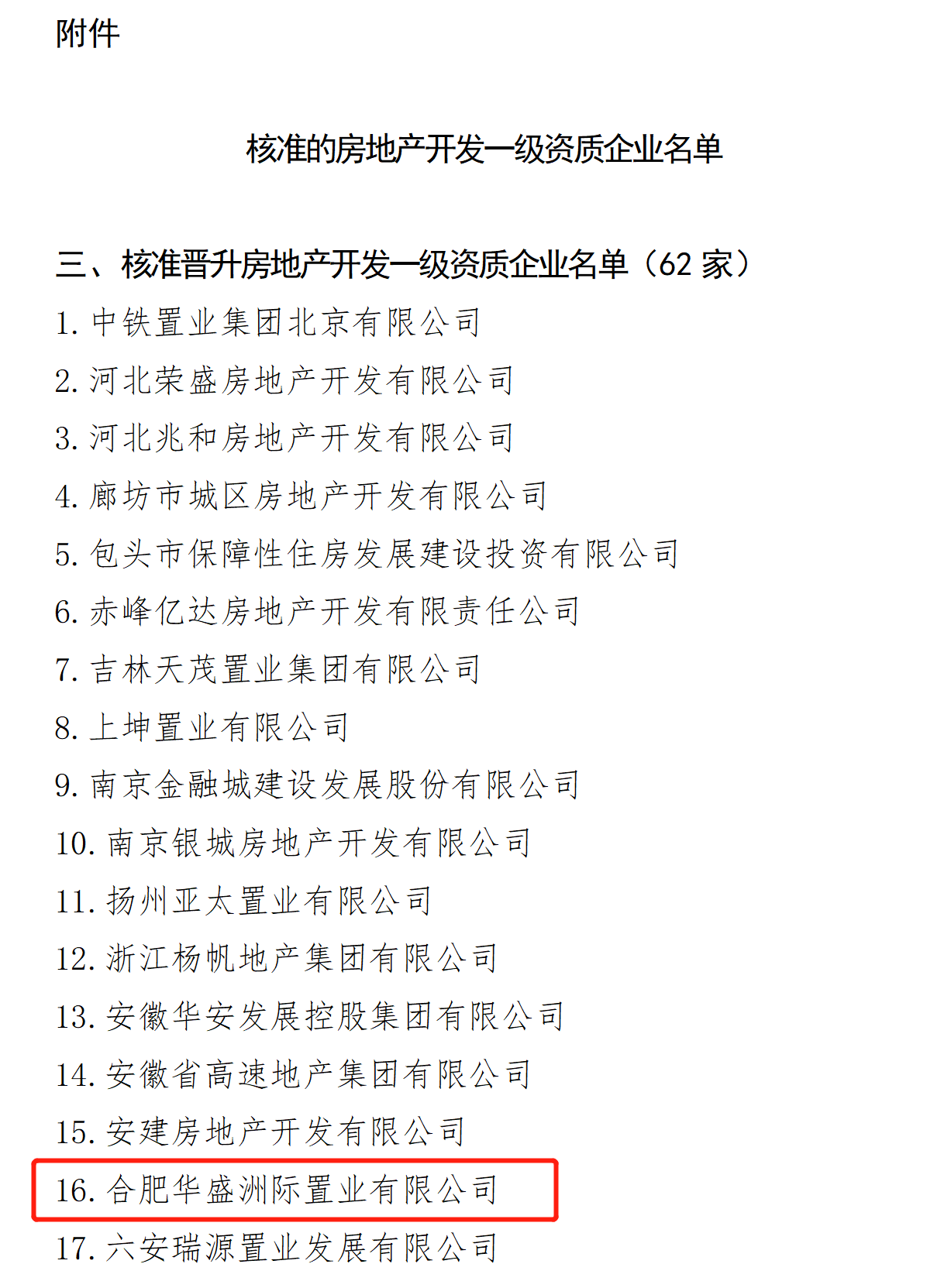 喜报!祝贺合肥华盛洲际置业有限公司晋升国家房地产开发一级资质企业