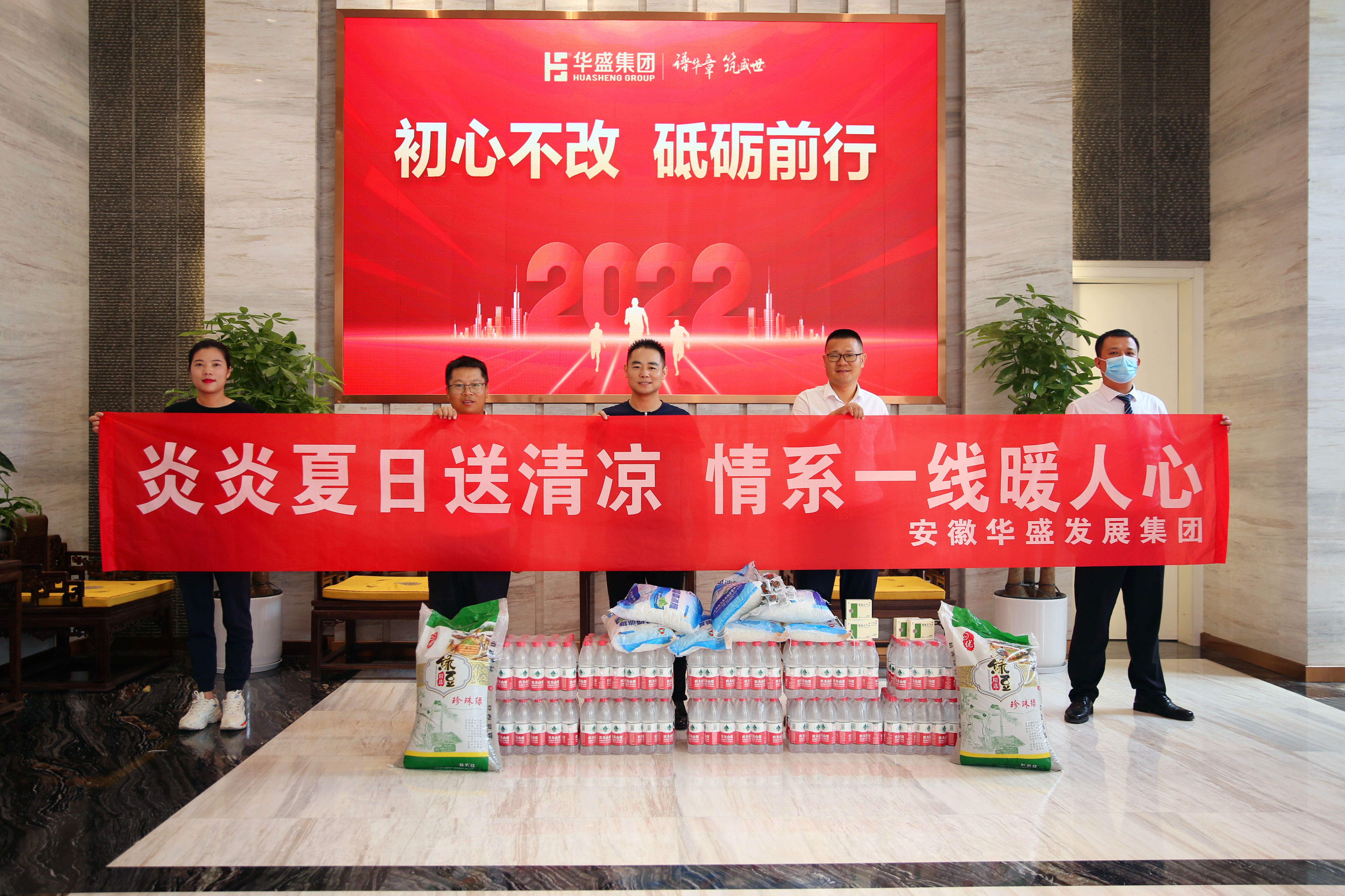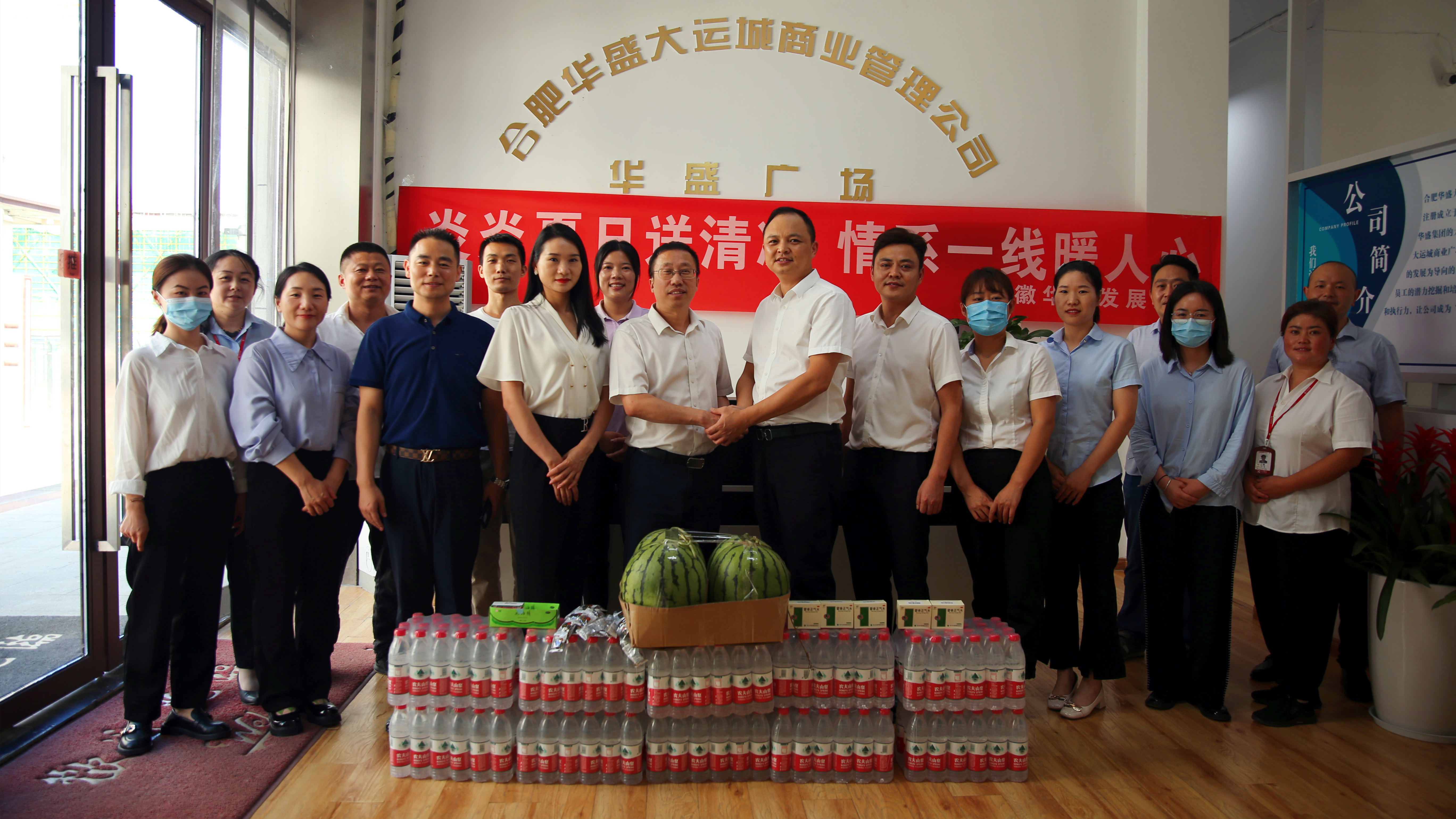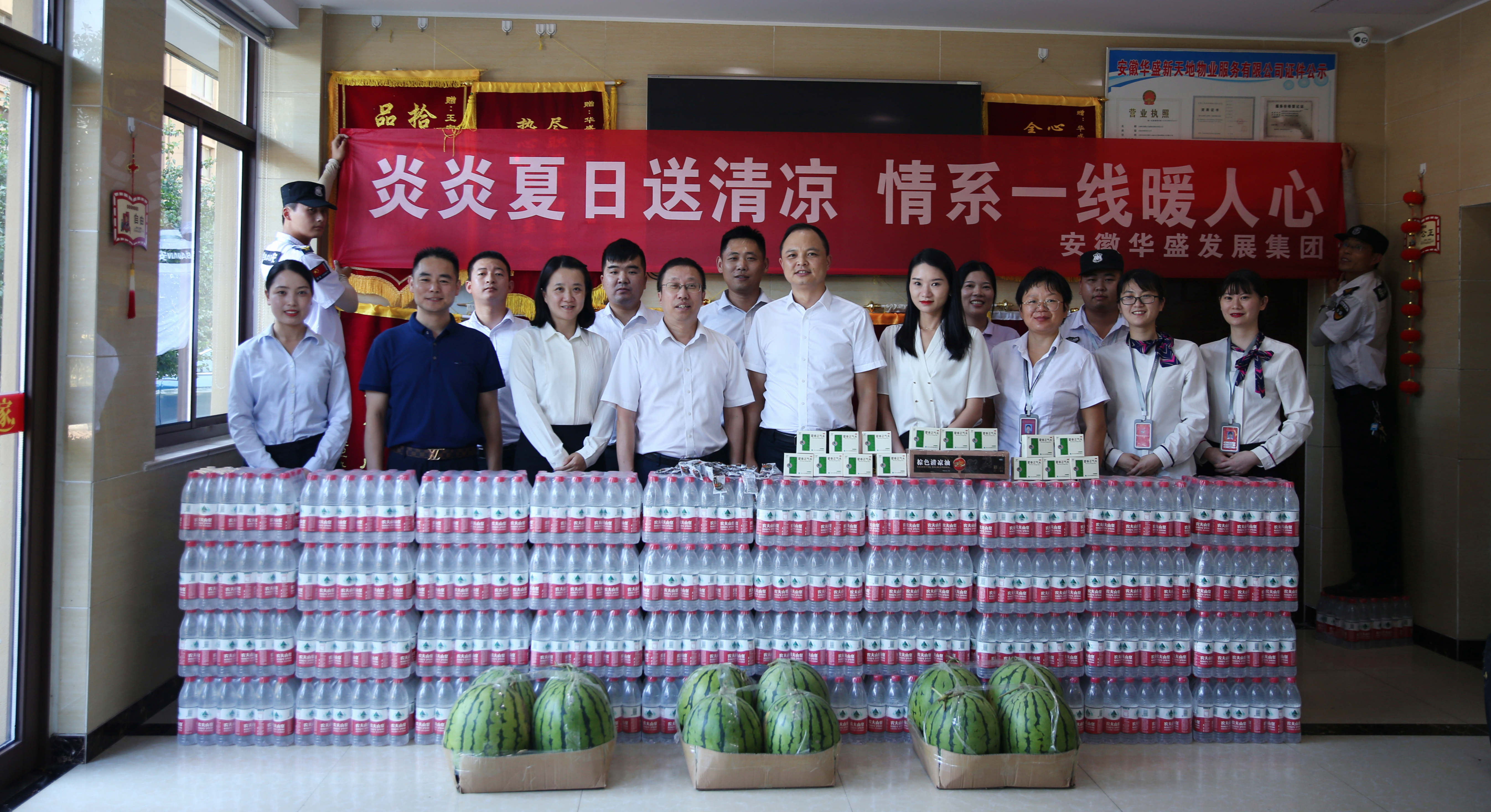 今年高温天气的炎热程度大大超过了往年,连续的晴热高温已经持续多日。华盛集团的各个项目工地和各分、子公司的基层服务部门仍在紧锣密鼓、热火朝天地持续推进生产和服务工作。此次一年一度的夏季高温慰问活动,集团领导把清凉送到了物业公司、商管公司、金海公司、华盛·和睦府、建华文化活动中心、华盛·江山御府、华盛·国悦府等项目的基层一线,把集团的关怀送到了基层员工身边。