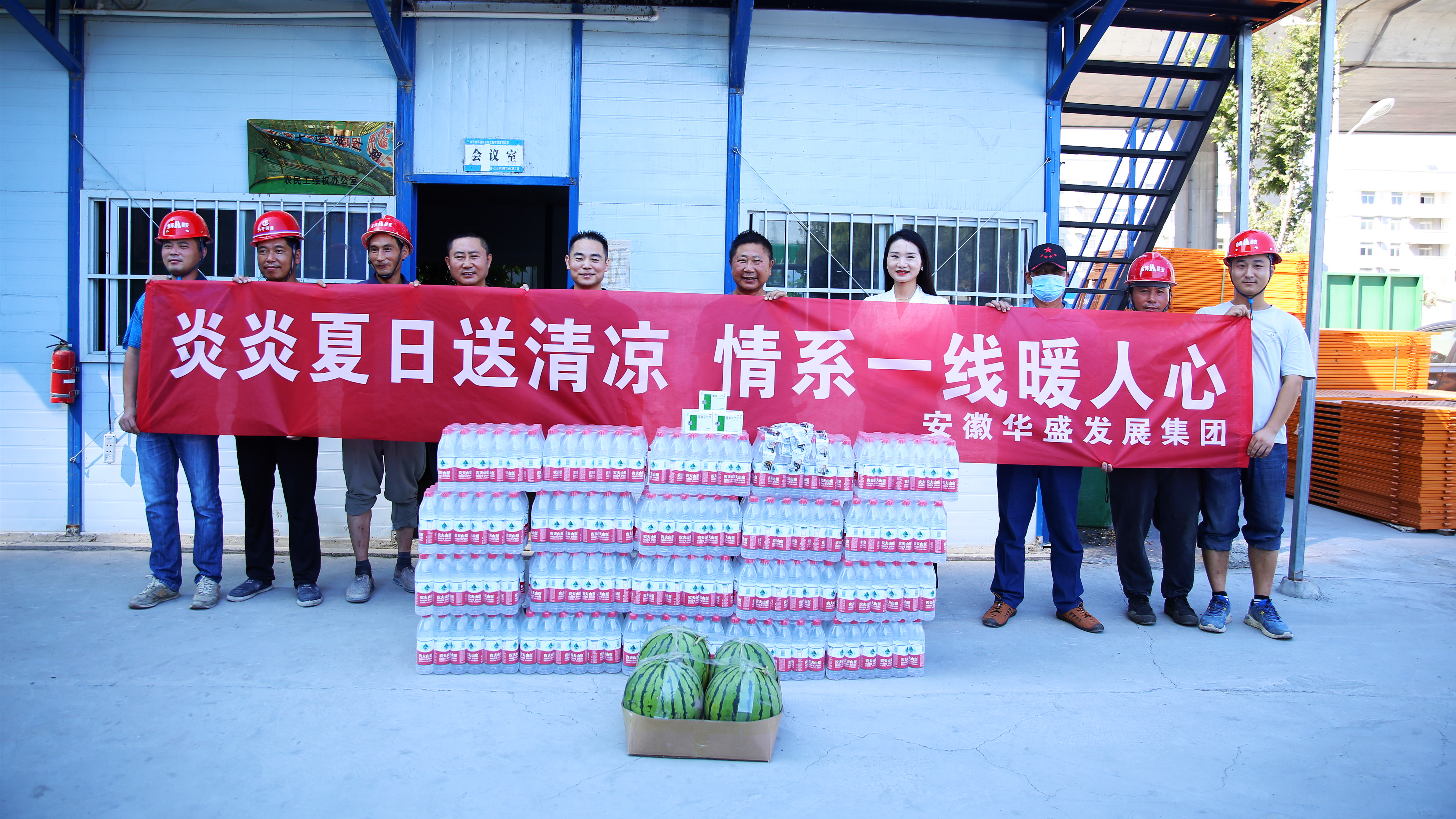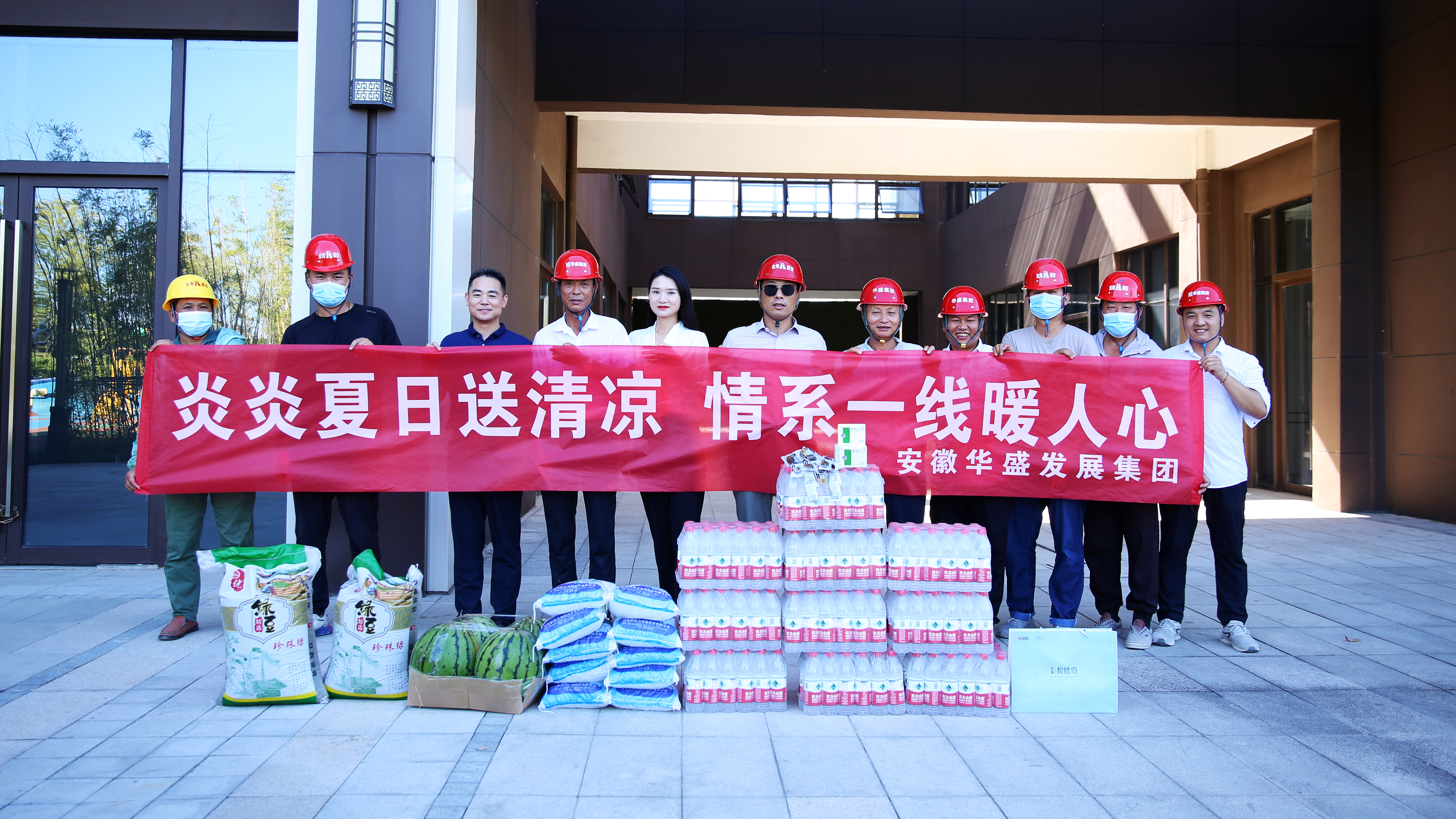 2022年8月12日,立秋刚过,骄阳似火。为做好高温期间防暑降温工作,保障一线员工安全健康地渡过高温期,华盛集团总裁余安云、物业公司董事长王辉、集团综管部、人力资源部来到集团各分、子公司和项目部工地,向奋斗在基层一线的员工们发放了藿香正气水、西瓜、冰糖、绿豆和风凉油等防暑降温物品。