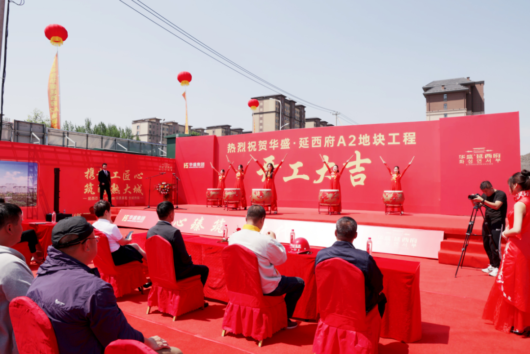 来到现场映入眼帘是全场彩旗招展,人潮涌动,洋溢着一派温暖又热闹的气氛。一支“龙腾盛世红鼓舞”拉开了喜庆的帷幕,在主持人致激情澎湃的开场词之后,华盛·延西府A2地块工程开工仪式正式开始。
